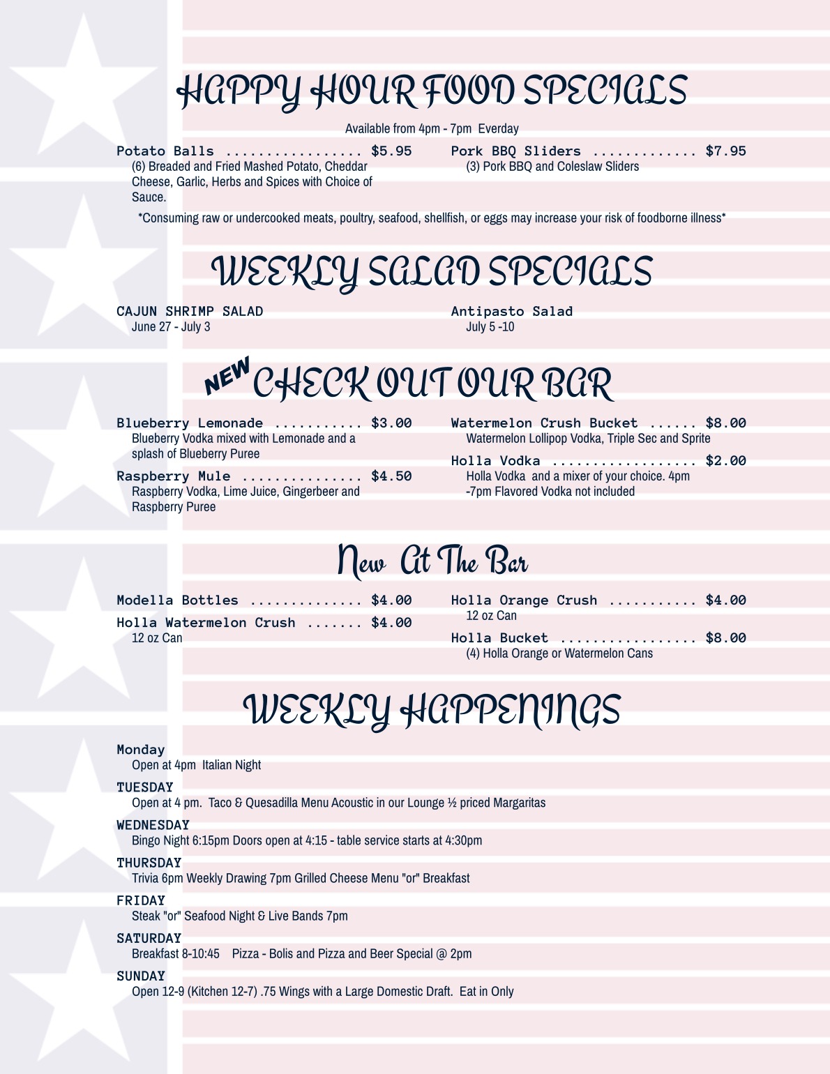 PLEASE CHECK OUR FACEBOOK PAGE FOR DAILY SPECIALS!